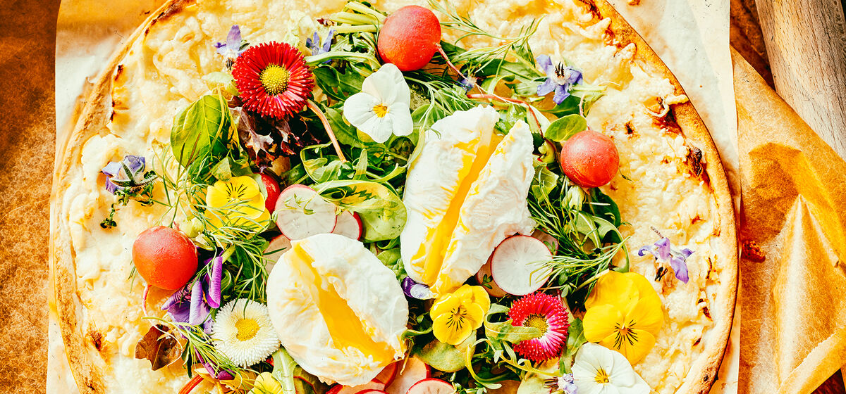 - Выньте фламмкухен из духовки, положите на него зелень, свежий редис и в центр – два разрезанных яйца-пашот. Вы можете экспериментировать с начинкой. Когда пост кончится, обязательно попробуйте приготовить фламмкухен с беконом и луком.