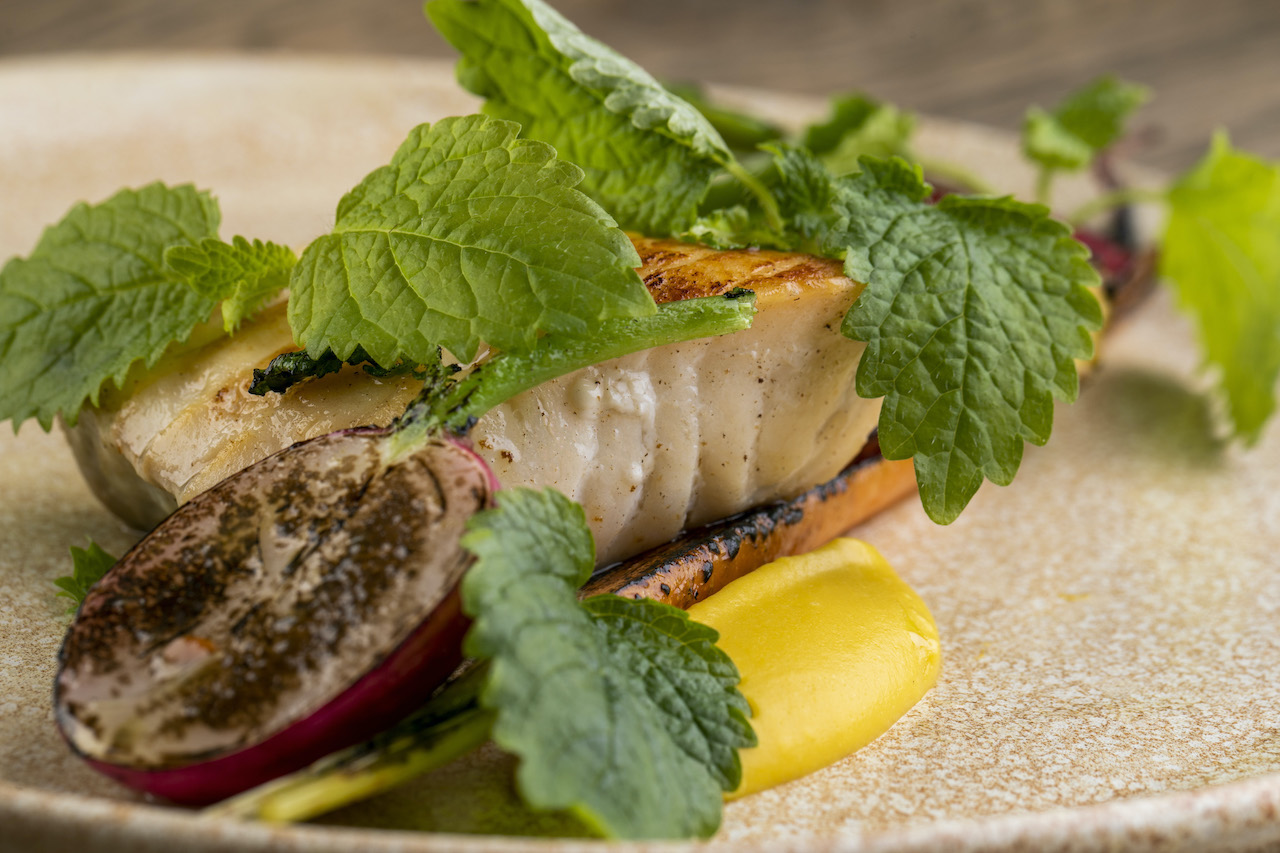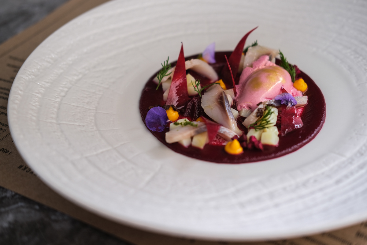 Одно из блюд – фирменный лосось 42°С с картофелем, молодым хреном, простоквашей и икрой. Рыба готовится при 42 градусах, охлаждается и подается вместе с горячим картофелем и обожженным на открытом огне луком-пореем. Заправка — соус из икры форели и сига со свежим хреном и простоквашей. Его коптят перед подачей, чтобы придать тонкий аромат костра.