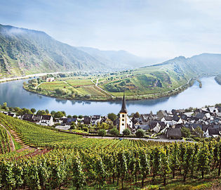 По склонам к Мозелю спускаются виноградники. Они окружают и знаменитый замок на возвышенности. Знатоки приезжают сюда в апреле – когда начинает цвести миндаль – или осенью, во время сбора урожая.