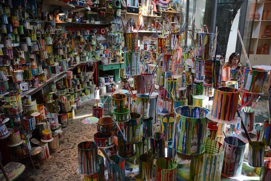 Еще один павильон – канадский – стоит посетить из-за того, что о нем рассказал Дмитрий Гутов, сам несколько раз участвовавший в Биеннале, на встрече в Посольстве Италии: «Я просто гулял по Биеннале в поиске новых идей и набрел на ничем неприметные цветные банки, их было много. И вдруг я замечаю, что от этих баночек тянутся едва заметные нити, которые соединяют эти баночки и тянутся вверх. Я подумал, вот как интересно. Спрашиваю у смотрителя - а как вам удалось довести такую хрупкую структуру неповрежденной? Она сначала не поняла, а потом сказала, рассмеявшись - да, это у нас давно уже руки не доходят снять паутину».