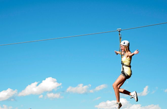 От простого к сложному – сначала карабкаемся по веревочным лестницам, шагаем по «воздушным» качелям и ступеням, расслабляемся, скатываясь вниз по тросу. Если ноги-руки не держат и страх высоты взял свое – можно в любой момент спуститься на землю с 12-метровой (в начале пути) высоты и вернуться к старту/финишу. Или выбрать маршрут попроще – для начинающих и детей (к их немалому восторгу, сюда их пускают, если они доросли до 110 см) предлагаются менее техничные, но все равно вполне серьезные испытания.