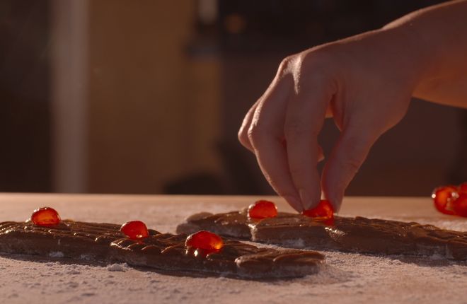 Вылейте 20 мл воды в кастрюлю и подогрейте в ней золотой сироп. Снимите кастрюлю с огня, добавьте коричневый сахар, муку, апельсиновую цедру, мед, пищевую соду и специи, перемешайте их и сделайте тесто. Добавьте разрыхлитель в оставшуюся воду, смешайте с тестом.