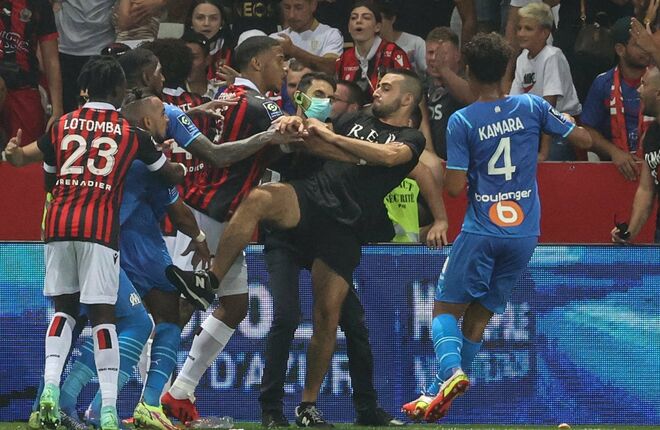 Во время матча между «Марселем» и «Ниццей» брошенная в спину игрока бутылка спровоцировала потасовку на поле.