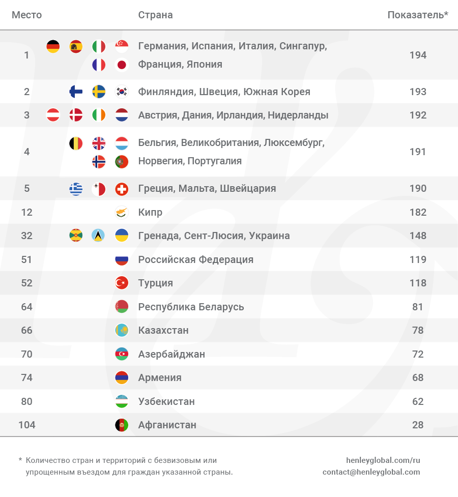 Впервые за 19 лет наблюдений компании сразу шесть стран заняли первое место с рекордным количеством возможностей для безвизовых путешествий: четыре из них страны Европейского союза – Германия, Италия, Испания и Франция, две азиатские страны – Сингапур и Япония. Держатели паспортов этих стран могут путешествовать без визы по 194 направлениям мира (из 227).